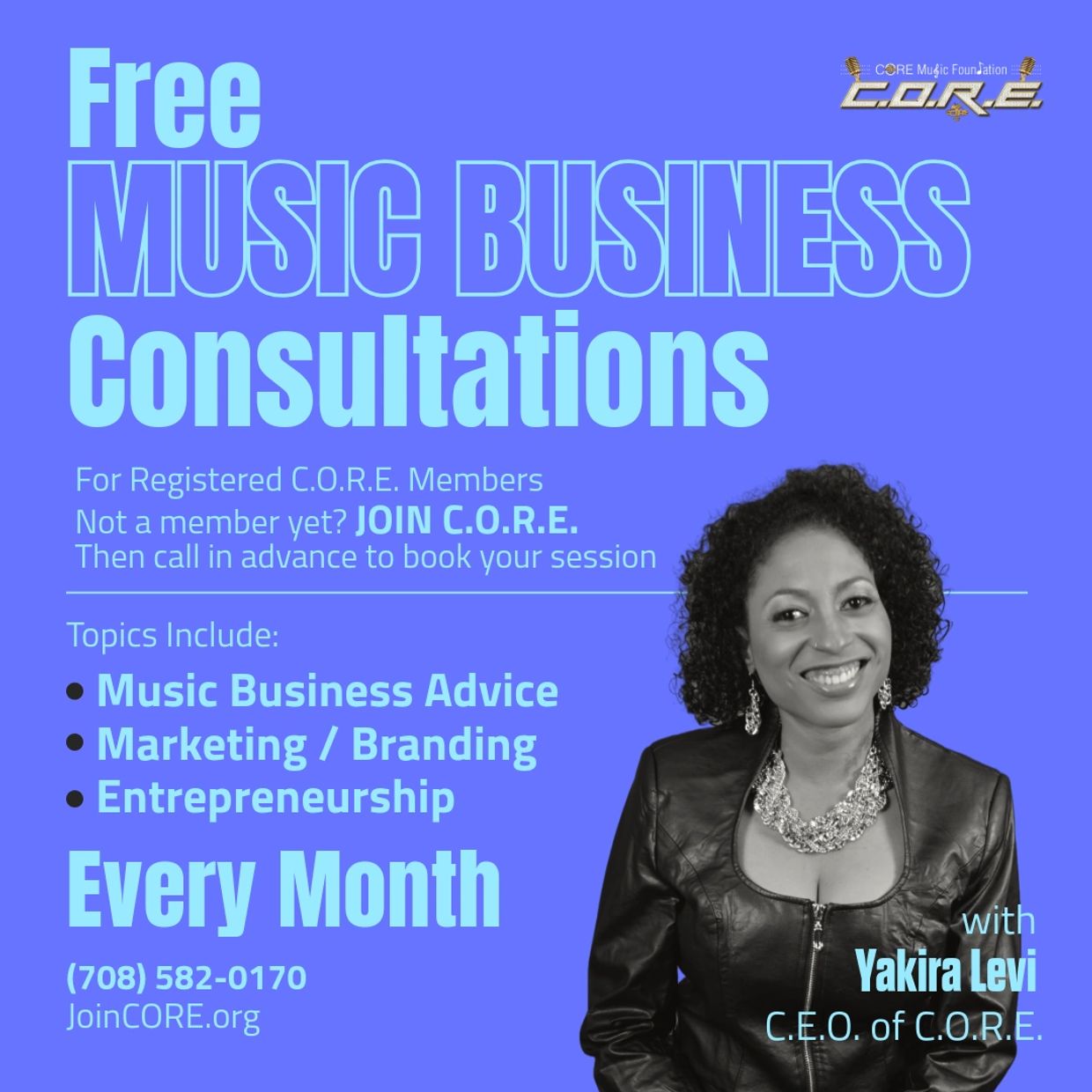 Entertainment Business Professor and Music Industry Professional, also specializing in marketing via branding, storytelling, media, music, and events. Yakira Levi offers expert guidance and resources for aspiring musicians and industry professionals alike. Teaching creatives the business, how to protect their intellectual property and personal energy, and suggesting ways to help their art prosper. Providing free music business consultations for registered C.O.R.E. members.